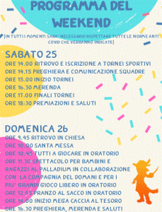 Dettagli Evento domenica | 26 Settembre 2021 8:00 - 20:00 Oratorio di Castello sopra Lecco Festeggiamo la riapertura dell’oratorio dopo la pausa estiva come da programma. Scarica il “VOLANTINO FESTA ORATORIO 25-26. 9 . 2021” Clicca qui e iscriviti alla giornata di Sabato Clicca qui e iscriviti alla giornata di Domenica